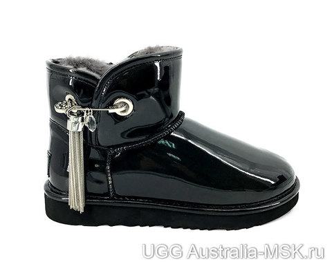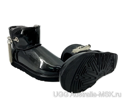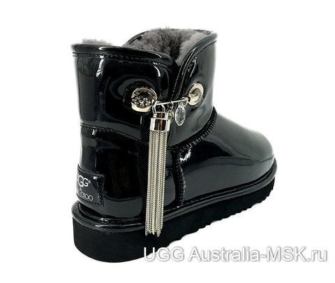 Дизайнерские мини угги UGG & Jimmy Choo Mini Black сине-зеленые лаковые. Лаковая непромокаемая кожа, хит сезона осень/зима 2018 года. Угги декорированы эффектной боковой застежкой в виде английской булавки с подвеской украшенной струящимися цепочками мелкого плетения. Эти эффектные угги станут главным украшением любого Вашего образа. В модели сочетается высшее качество материалов, непревзойденное мастерство бренда UGG Australia и модный стильный дизайн от великого метра моды дизайнера Джимми Чу. Угги произведены из натуральной овчины, надежно защищающей от самых сильных морозов.